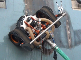 | Composed of a motorized robot with magnetic grip on the steel plate, with rotating jets of pressurized water, operated with radio control. Combined with a pressurized water motor pump group, also equipped with a vacuum pump for the suction of the water projected with the detached waste that is separated from the aspirated air by means of a vacuum cyclone tank with automatic discharge. |
